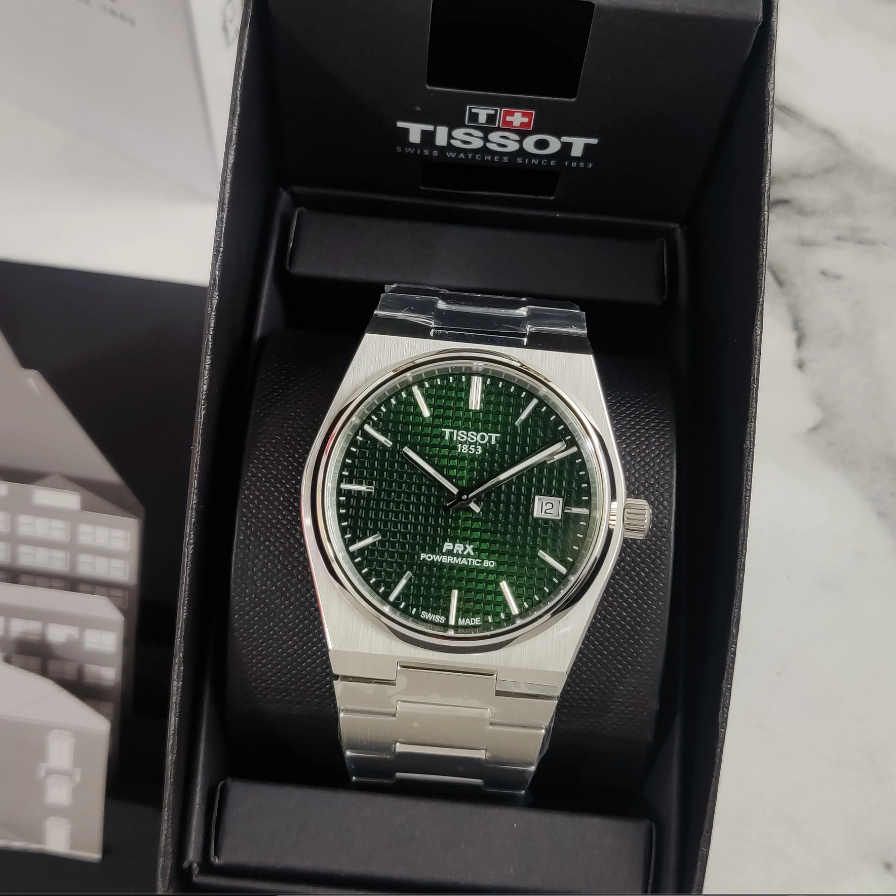 TheTissot PRX Powermatic 80(Ref.T137.407.11.091.00) brings a modern edge to a timeless classic — with a boldsunburst green dial,Swiss automatic movement, and a transparent caseback that reveals its powerhouse 80-hour reserve.